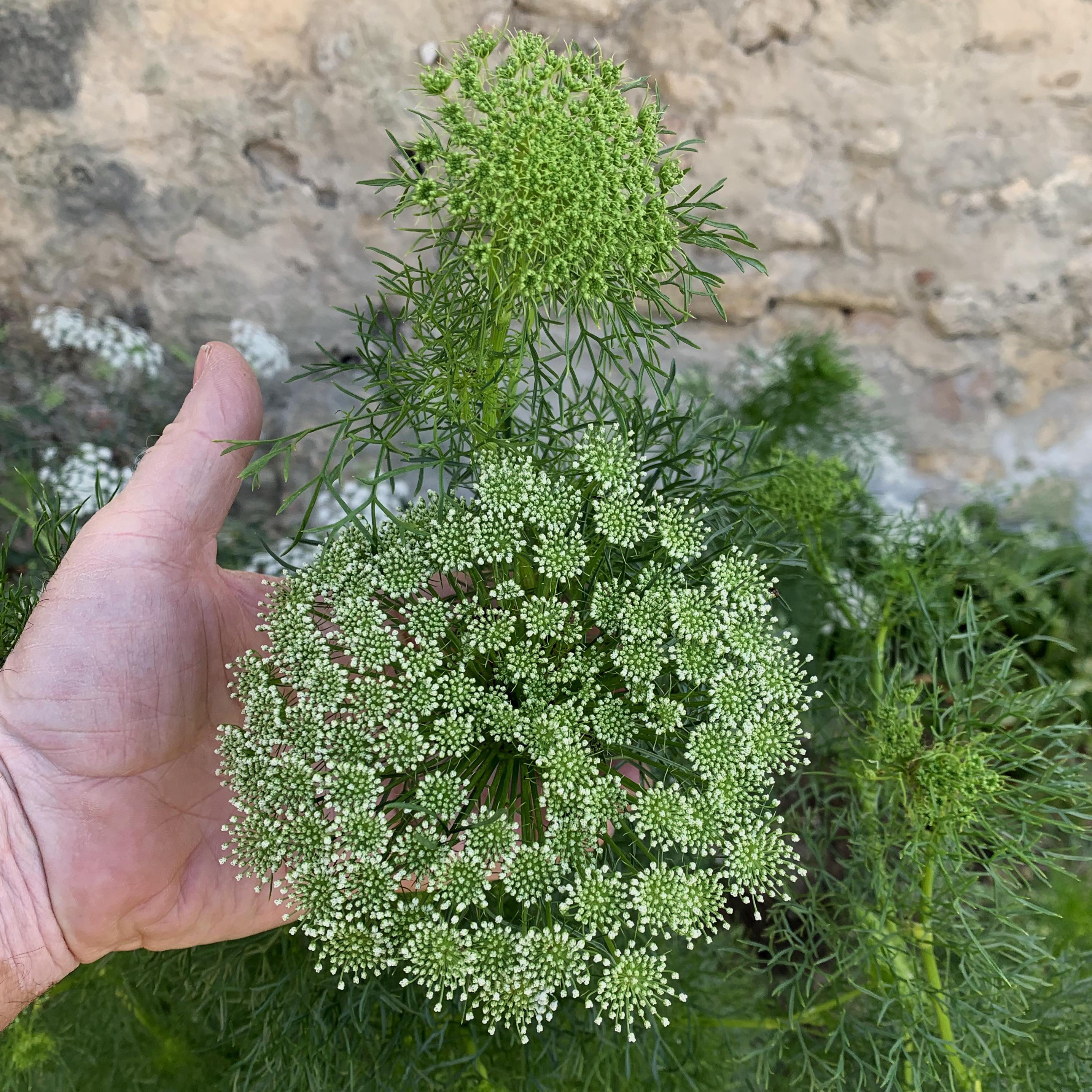 Ammi visnaga belongs to the family of Umbellifers or Apiaceae, like carrots and celery. This annual plant is native to the Mediterranean region. It is also found in large quantities in North Africa. This plant forms a clump that reaches 1m (3ft) in height, approximately 60cm (24in) in diameter, and shows rapid growth. It has a taproot. Its stems are branching, robust, furrowed at the top, and entirely covered in strongly dissected light green foliage. The leaves, similar to those of fennel, are hollowed out with small channels, laciniate, and highly aromatic. The flowering occurs from July to September-October, in the form of a curiously constructed white umbel, with a powerful and pleasant fragrance, green, herbaceous, slightly pungent, and slightly aniseed. The flat and white umbel becomes concave and more or less green when ripe. It consists of very dense umbellules (mini umbels) composed of numerous thick and connivent ray florets after flowering, which are inserted on a receptacle that widens into a disc when ripe. The flowers start off white and evolve into cream, acid green, and yellowish-green with age and fruiting. They produce abundant nectar, attracting numerous insects.