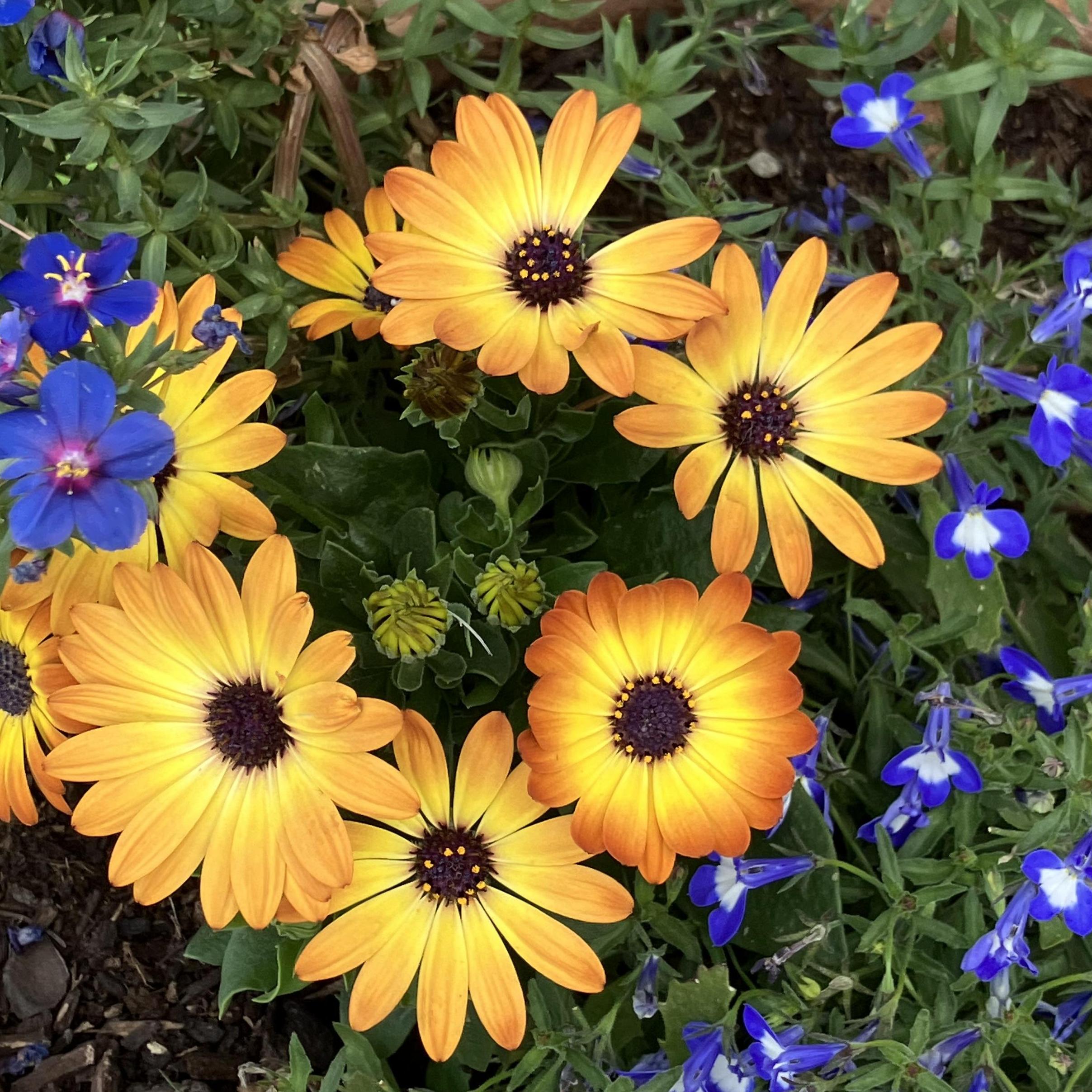 Osteospermums have become indispensable, as they are very willing to flower on dry slopes in open ground or on terraces and balconies exposed to heat. They can be associated with catnips, shrubby salvias, verbenas, Lantanas, or immortelles in a dry garden. They will highlight borders and flower rockeries. In a mix of colors, they form remarkable ground covers. In flower pots, they can be paired with Bidens or Erigeron karvinskianus, for example.