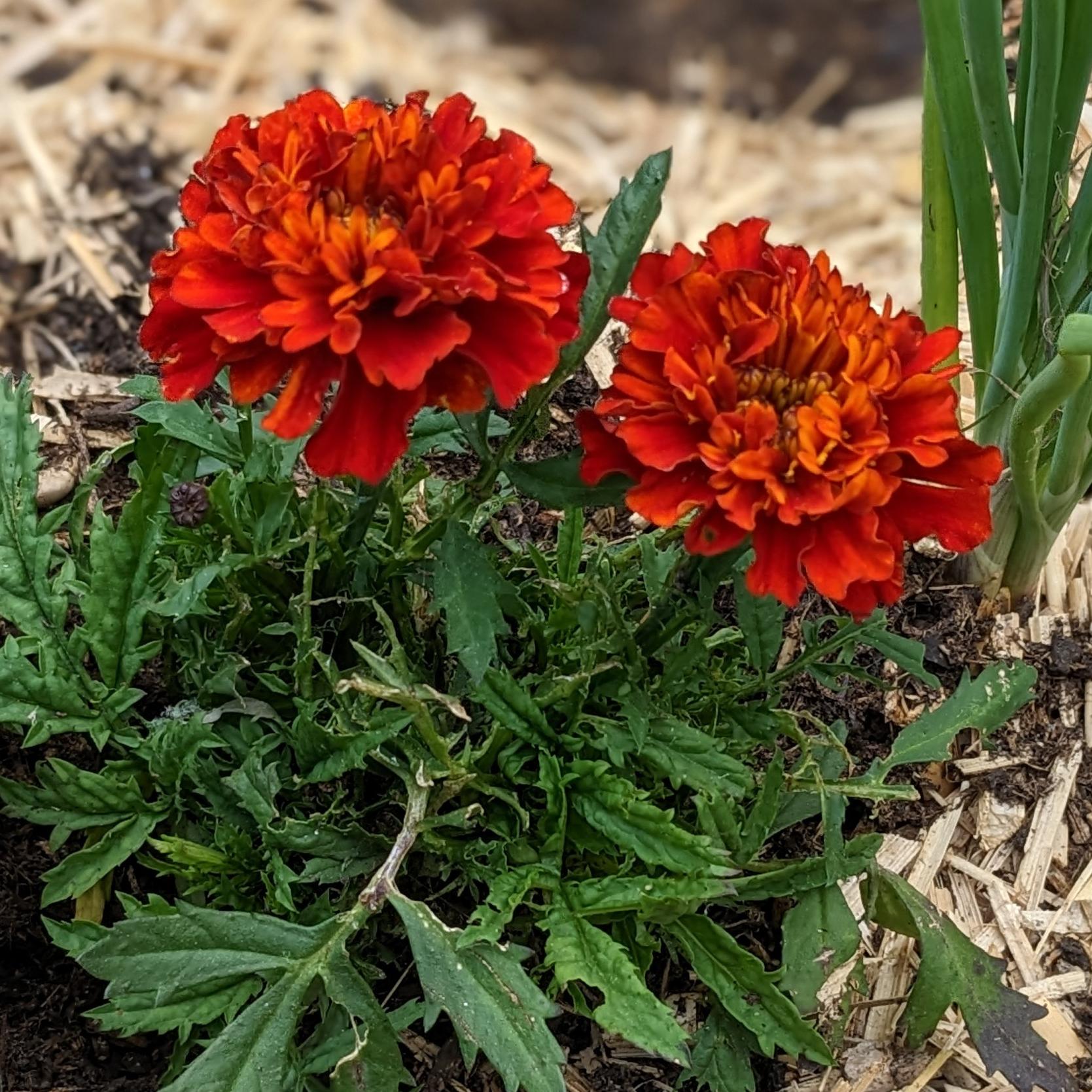The Tagetes (x) erecta 'Fireball' is a perennial herbaceous and tender plant, grown as an annual in most of our climates. This hybrid plant from the Asteraceae family is of horticultural origin, derived among others from a wild species paradoxically named African Marigold, native to Mexico, Central America, and the western part of South America. Its other parent, Tagetes patula, is native to tropical regions of the Americas, from Mexico to Bolivia. The plant quickly forms an erect and branched bushy clump from the base, reaching 25 cm (9.8 in) in height and 30 cm (11.8 in) in diameter. Its sturdy angular stems bear large double flowers, terminal, with variable colours on the same plant, resembling large fluffy pompoms. This is a truly exceptional colour among Marigolds, which changes more slowly from yellow to red in cool conditions, such as those experienced in spring, than in midsummer.