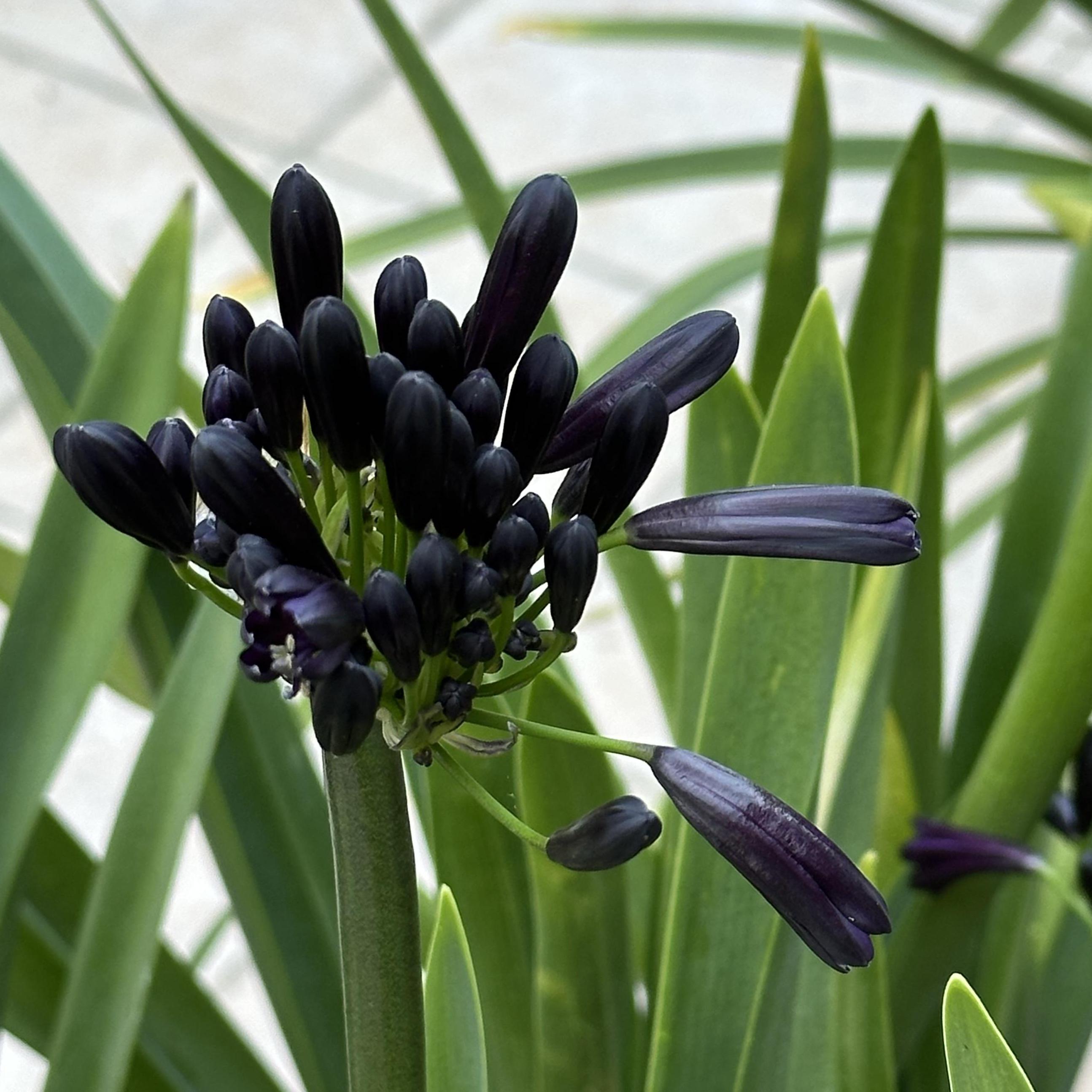 Agapanthus inapertus 'Black Magic' is a fascinating new variety offering one of the darkest flowerings, if not the darkest. Black buds open into nearly black, deep indigo blue bell-shaped flowers, on large umbels reaching 80cm (32in) above the ground. This deciduous variety is moderately hardy, down to -10°C (14°F), and should never lack water during its growth period. A troubling and dark flower, created to bring out contrasts and enhance white blooms, in borders, in pots, or planted in small groups near high-traffic areas.