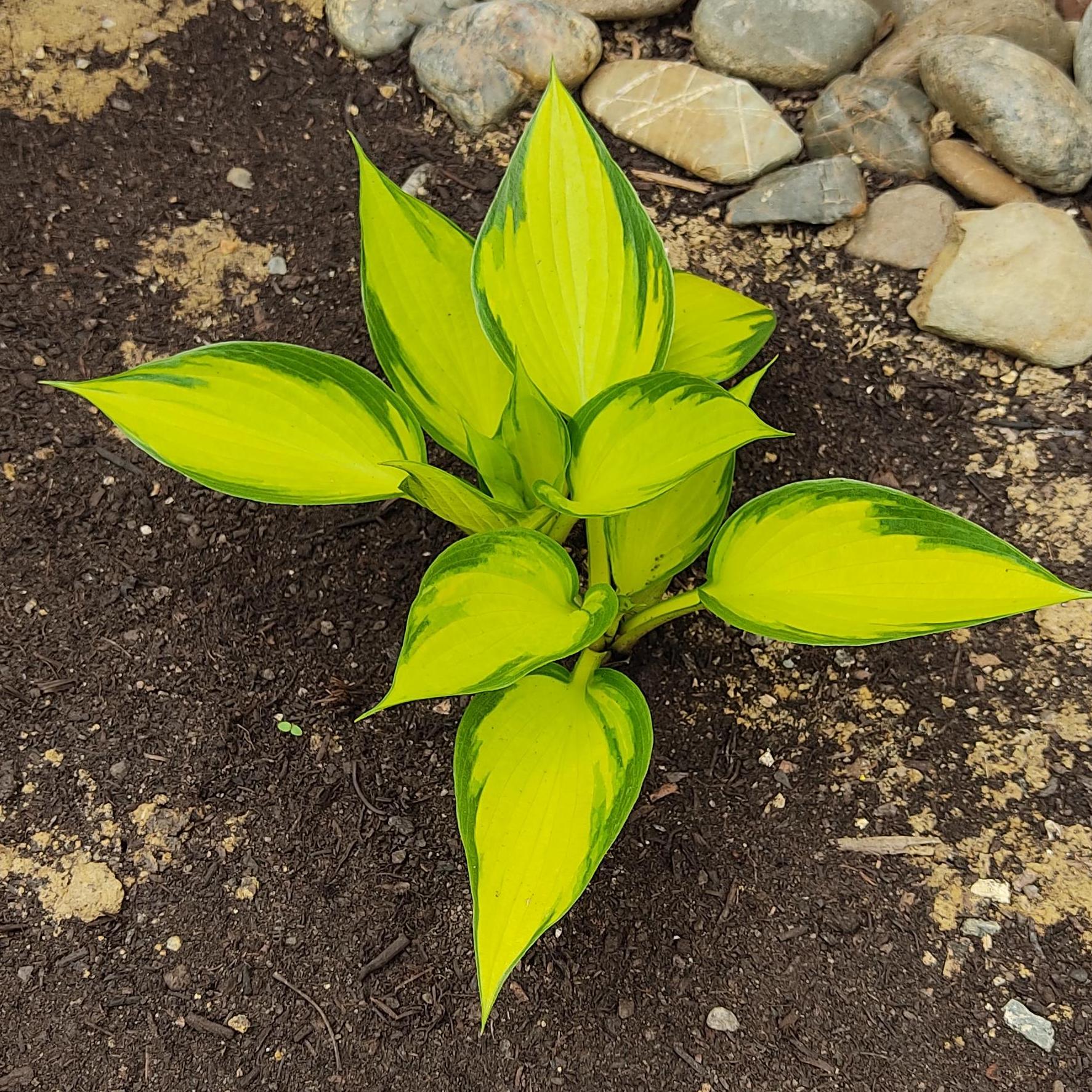 Hosta 'Justine' is a lovely cultivar of medium size with variegated foliage. It is a shade-loving plant that forms a bushy clump of very shiny leaves, well-veined, elongated in shape, with golden yellow margins and dark green centres. A few hours of sunlight per day allow it to maintain its bright yellow colour. Its summer flowering, with bell-shaped spikes in shades of mauve, on reddish-purple flower stalks, adds to its charm. Whether in the garden or in a pot on the terrace, it brings light and distinction. Good resistance to slugs.