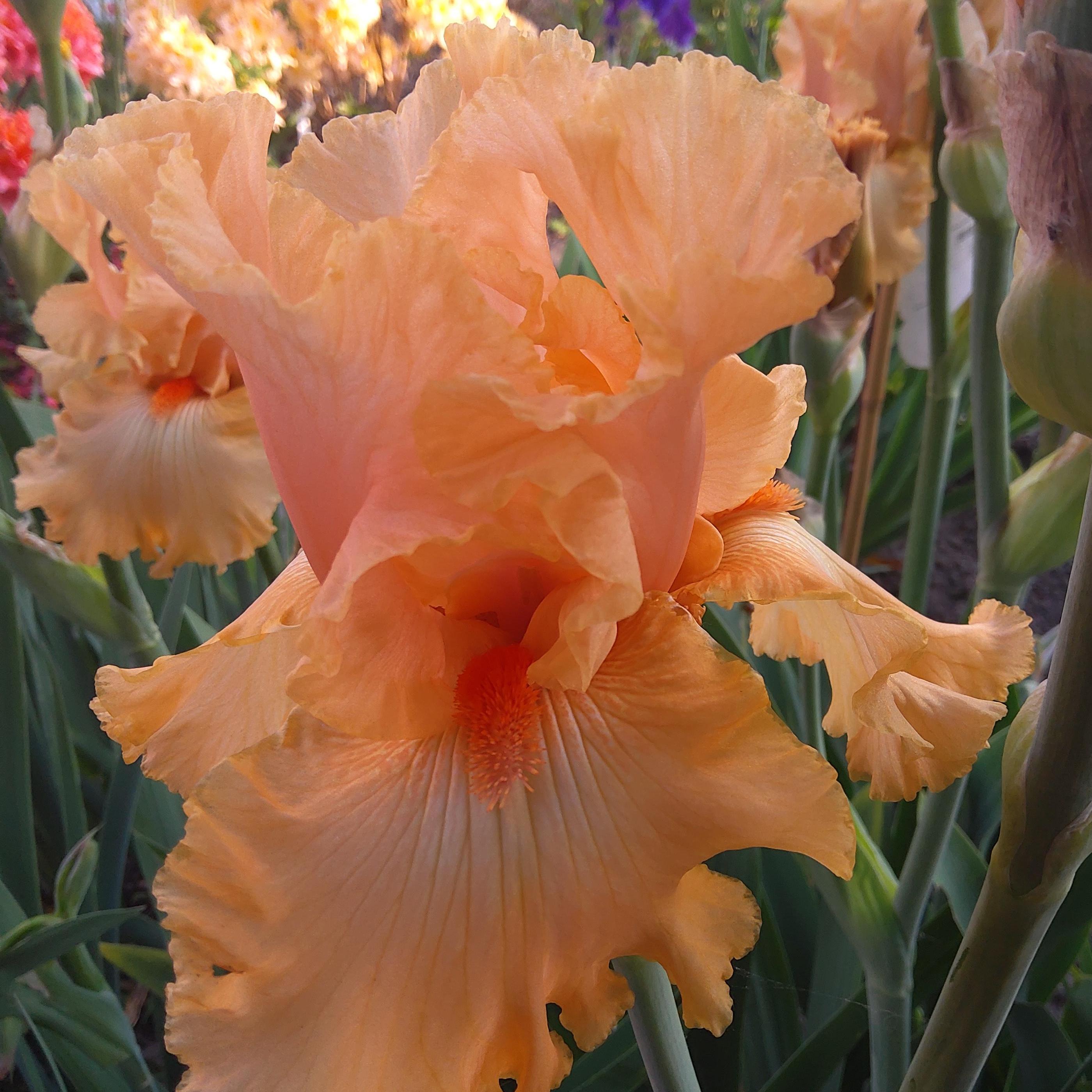 Iris 'Qualified' (TB)is a variety of tall garden iris that is quite spectacular because of its large apricot flowers and gentle fragrance. A bright fruity colour which is enhanced by intense orange beards. The plant forms beautiful clumps that will bloom in spring in borders and rock gardens.