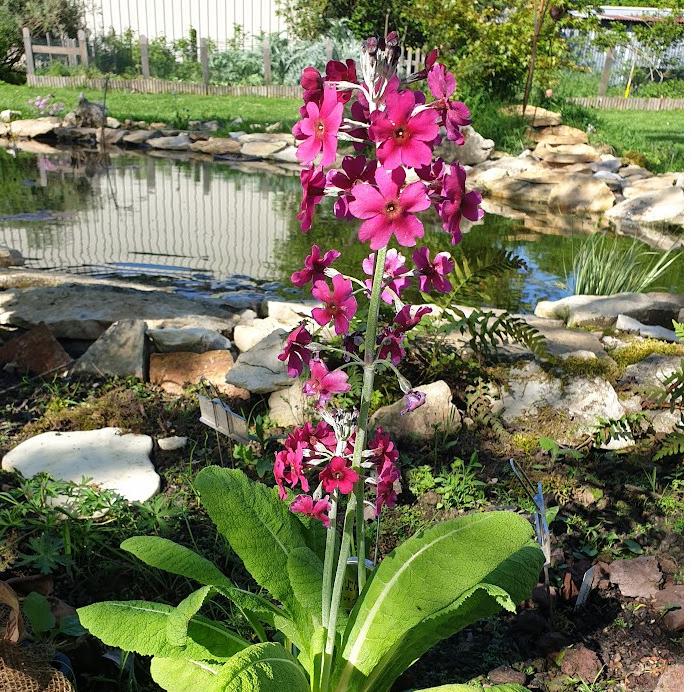 The Primula pulverulenta belongs to the primrose family, like all primroses. It grows in the wild in damp high-altitude meadows in the Chinese provinces of Sichuan. This perennial first produces a rosette of deciduous leaves, light green to acidic green, slender and dentate, measuring about twenty centimetres in length, including the petiole. The veins are visible on the leaves, which have a wavy appearance. Flowering occurs in June-July, in the form of tall, sturdy stems measuring 45 to 60 cm (18 to 24in), adorned with 4 to 10 whorls (clusters) each containing 4 to 12 tubular flowers, tightly packed together, typical of primroses. Their colour is a pure pinkish-red to cherry red or amaranth red, enclosed in a more or less pruinose jade green calyx. This vigorous and sturdy perennial readily self-seeds in moist soil.