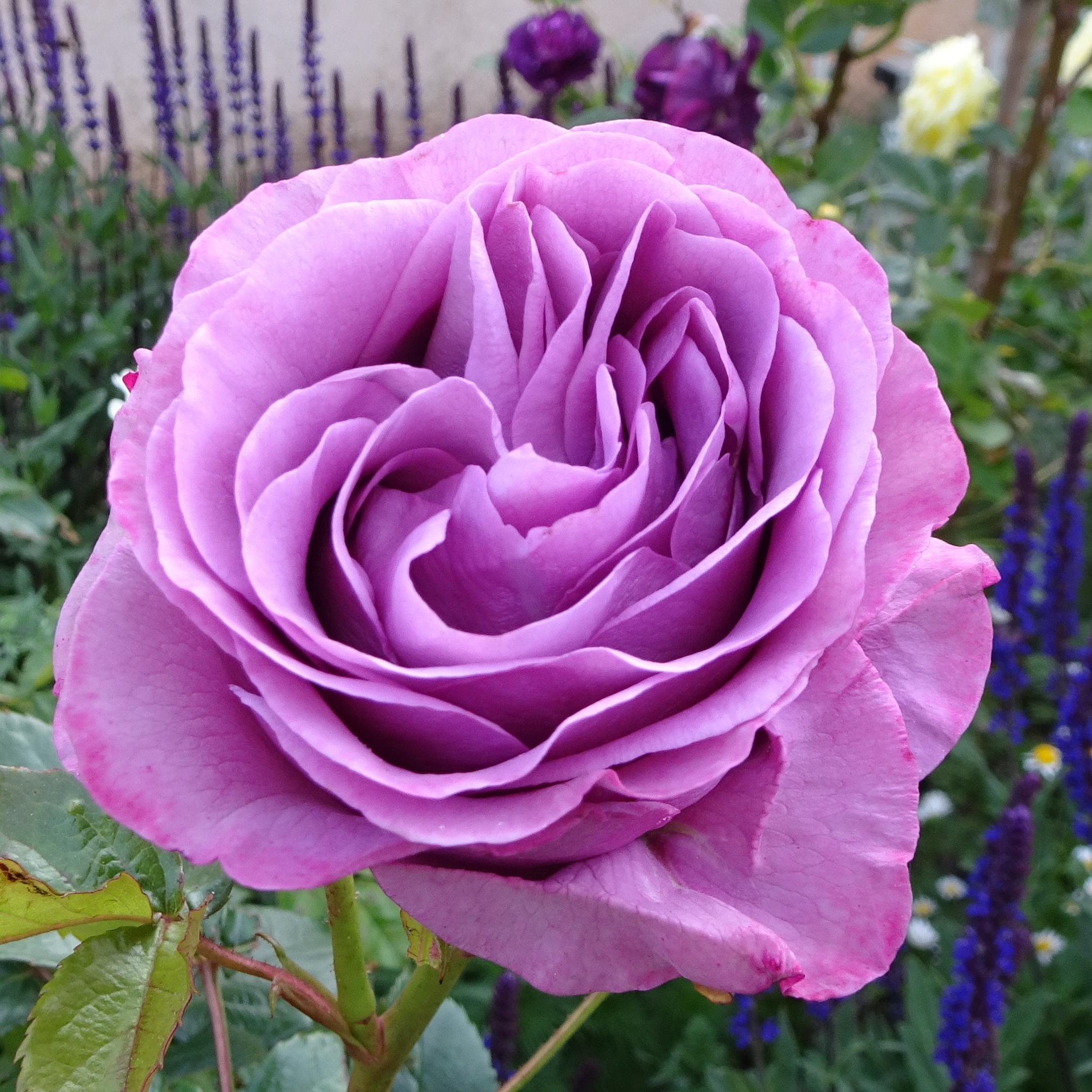 The roses, in a lovely purple-violet colour, bloom from June to October. It is a well-filled cup presenting its multitude of tightly packed petals. The flower measures 10-12 cm (4-5in) in diameter, and it holds up well as a cut flower.