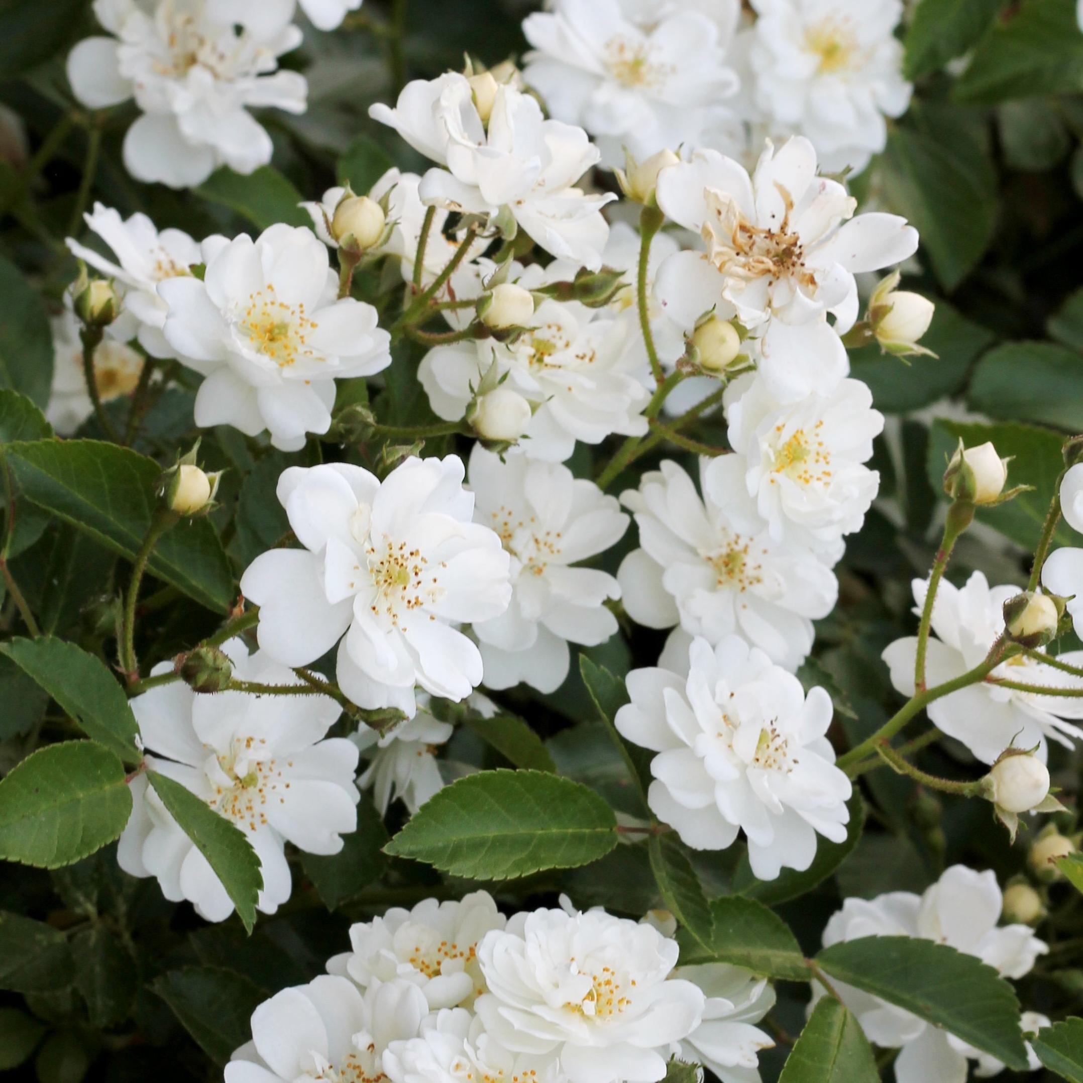 Rose Guirlande d'Amour meaning 'Garland of Love' is a recent and highly floriferous variety that combines many qualities. This large, robust and repeat flowering rose can be trained as a climber but also makes a beautiful free-standing bush. Its exuberant and ramified growth produces long and arching branches that can reach 3 metres (10 feet) or more. In summer, it forms a mass of flowers from the base, covered with long bouquets of small white roses with yellow centres, semi-double and highly scented. It then repeats in autumn, until the first frost. This splendid variety also shows exceptional health, resulting in particularly healthy foliage.