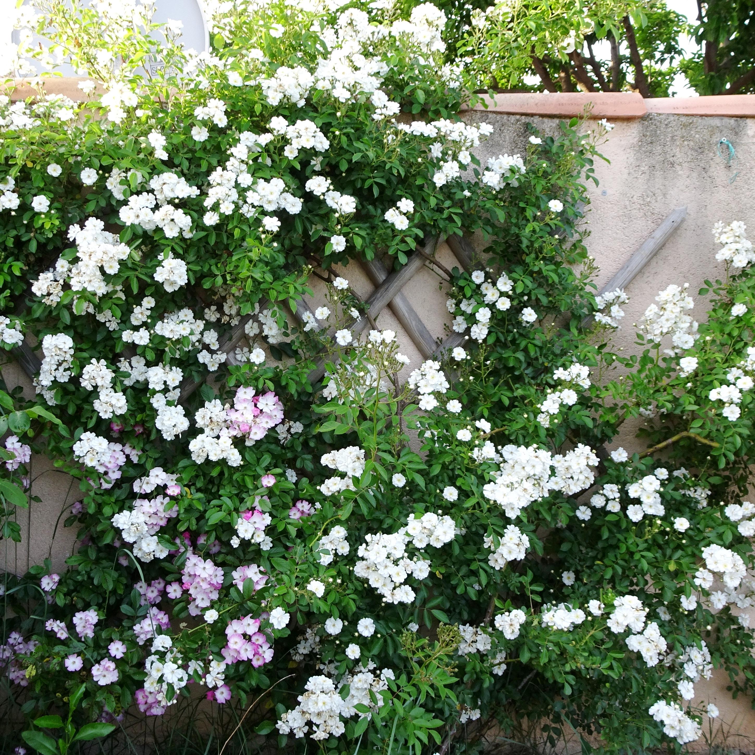Rosa Guirlande d'Amour is an enchanting, generous and adorable rose. It lives up to its promises, to the point that its flowering cannot be forgotten. Like other climbers, it is incomparable for covering walls, fences and small pergolas, but its moderate growth also allows it to grow without support in a flowering hedge in the company of a vigorous clematis like 'Montana' or 'Prince Charles', to gracefully spread out on a lawn, or to be planted behind slightly too formal flowerbeds. It is an ideal companion for dead trees that it will revive, or for sheds to which it adds a charming touch. Trained on an arch, placed in a large pot on the patio, it will create a romantic and scented specimen.