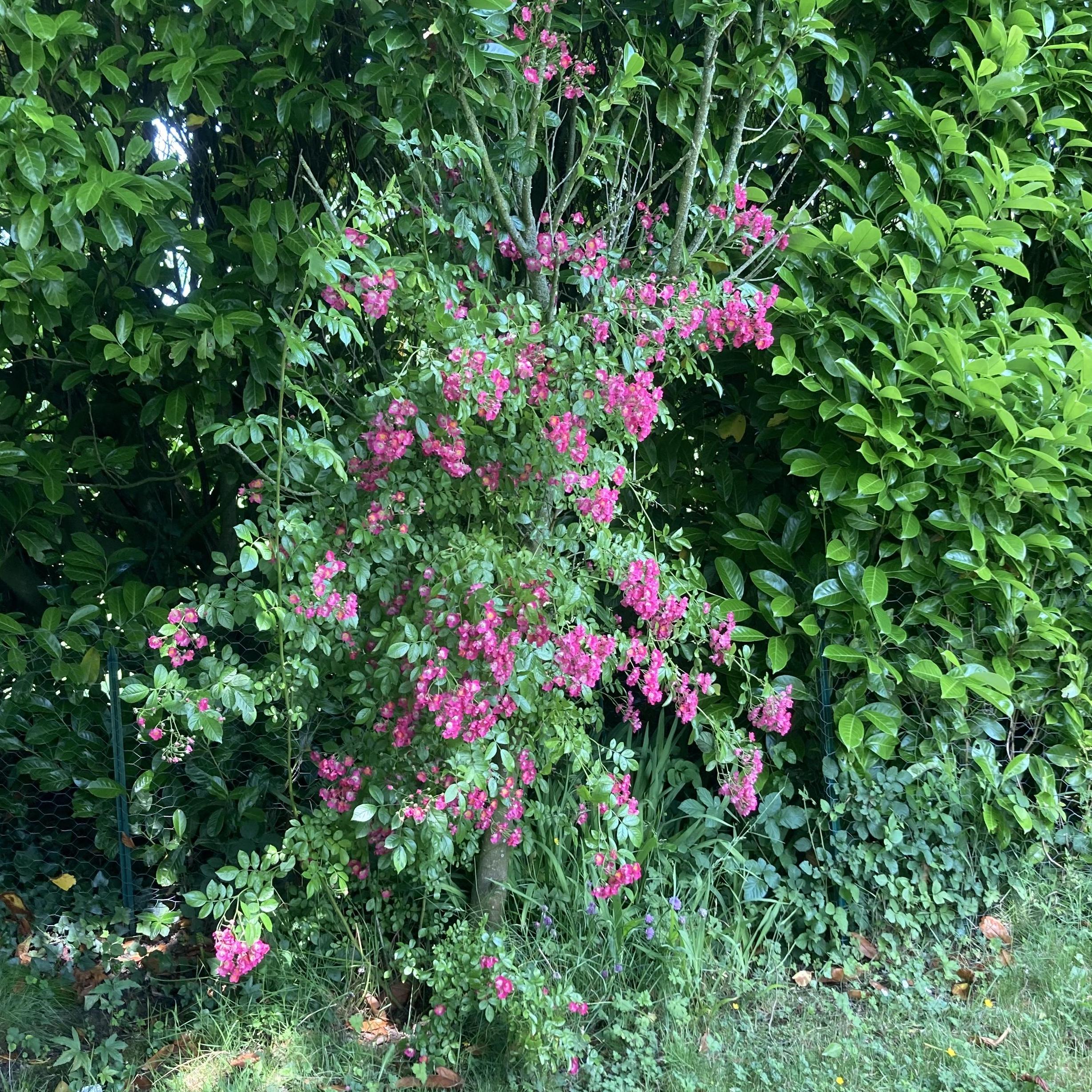 If you plant a climbing rose next to a living tree, the root system of the rose will compete with that of the already well-established tree. To control watering, here's a tip: plant the rose in a large container with a perforated bottom, at the base of the tree. The tree roots will not penetrate the container for at least a year. Remove the container after 1 year, for example by cutting one side, without disturbing the rose's root system. By then, the rose will have had time to develop its root system deeply and will be more resistant.