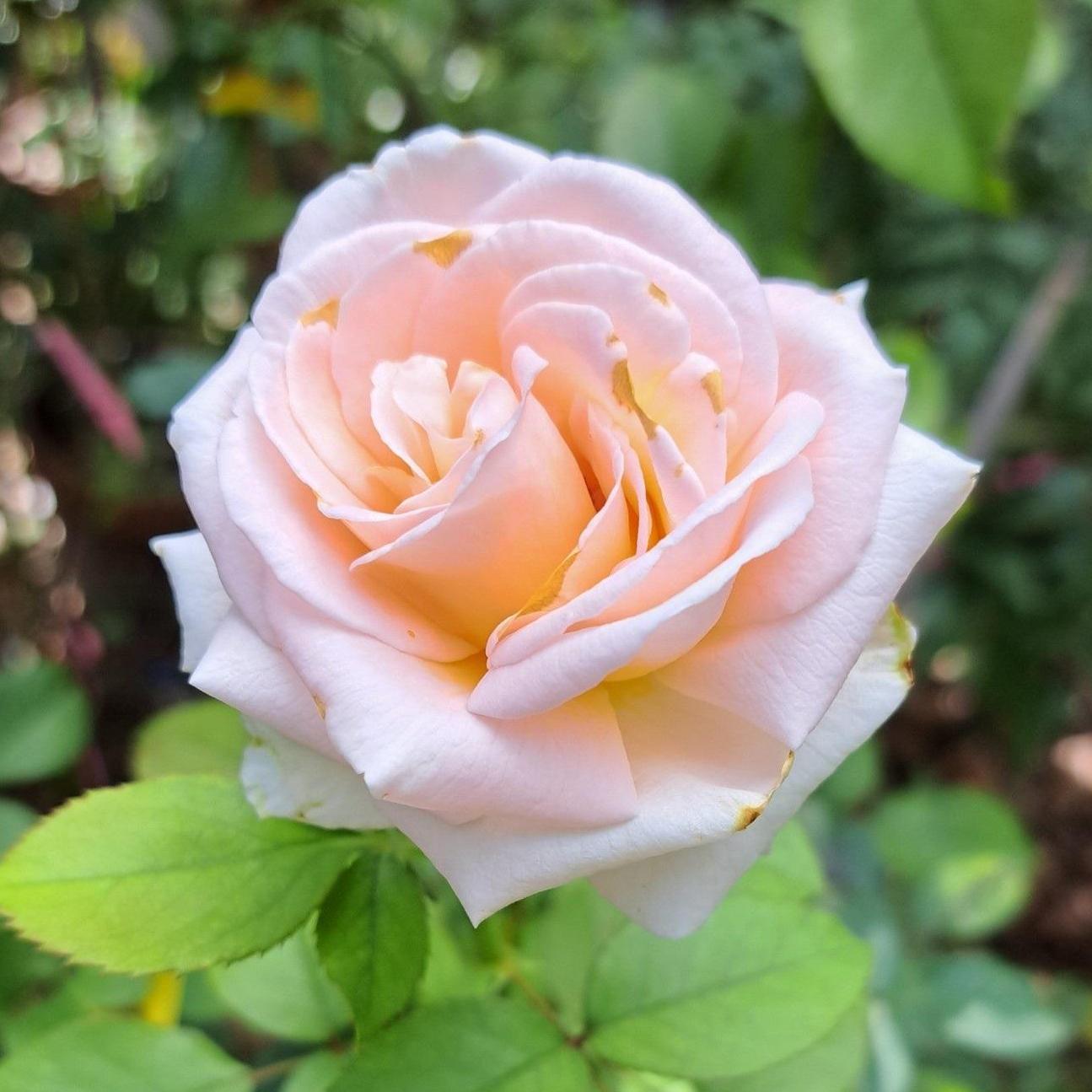 The Eve de Rothschild® rose belongs to the hybrid tea group, a category of roses prized for their elegant large flowers, often solitary or in small clusters, carried on long stems. This rose, with a bushy habit and vigorous growth, reaches a height of 90 cm to 1 m. Its flowering is particularly generous and perpetual, spreading from June to October. The round flowers, measuring approximately 12 cm in diameter, consist of nearly 45 petals. Their pinkish-white hue, combined with a strong fragrance with fruity notes, makes them particularly attractive.