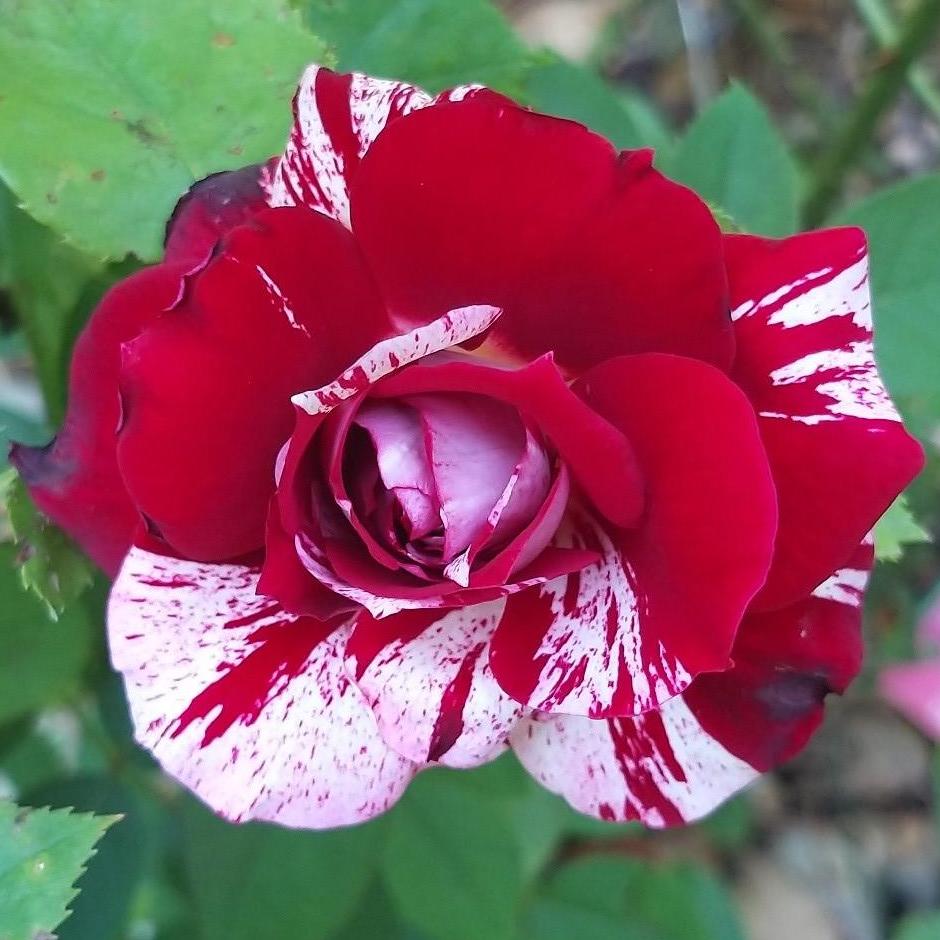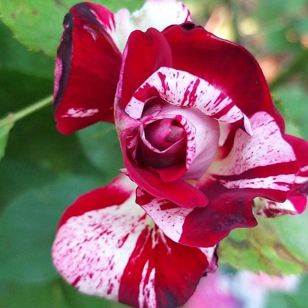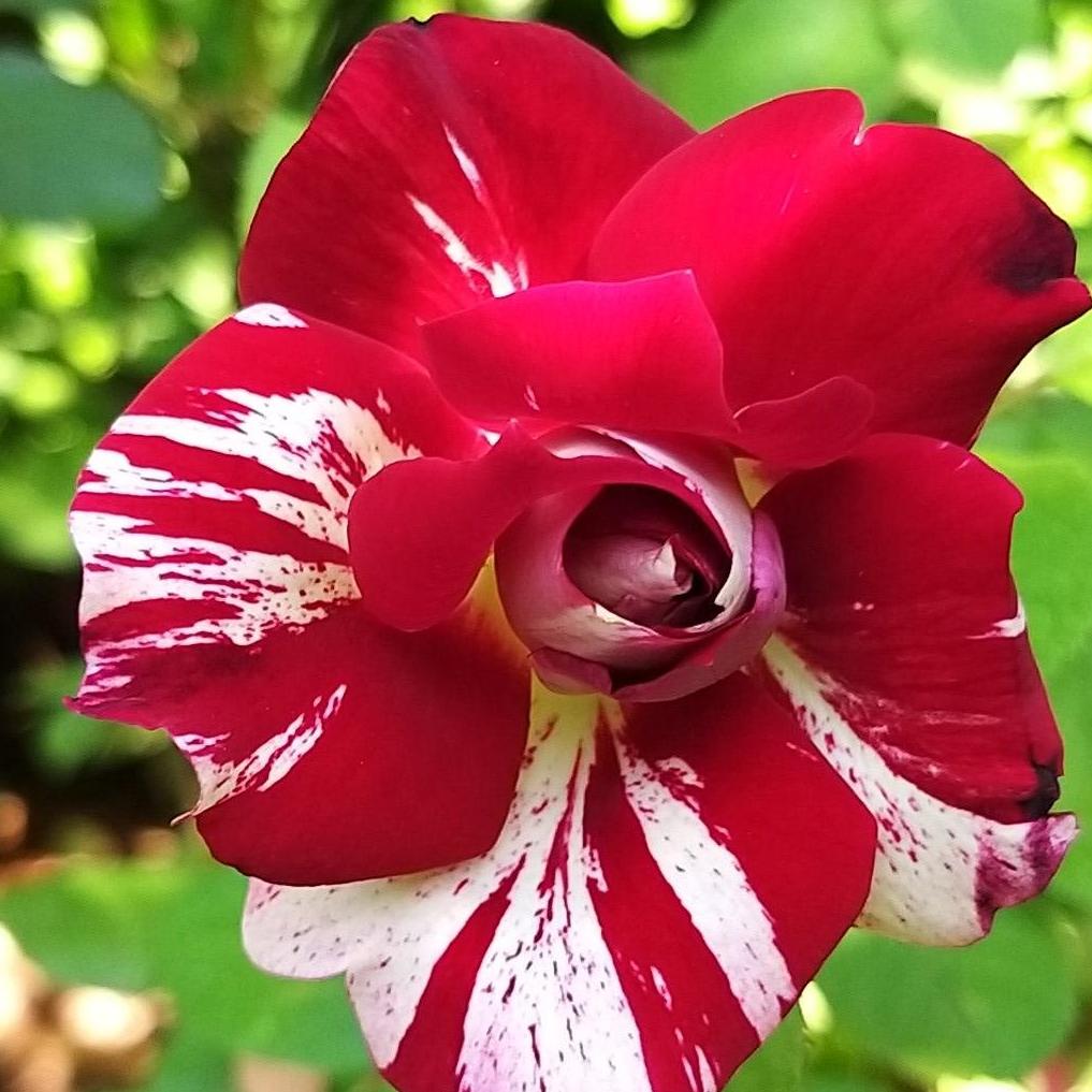 This hybrid variety belongs to the hybrid tea or large-flowered rose family. With rapid growth, it forms a plant with dense vegetation and a compact habit, reaching a height of 0.70 to 0.80m and a spread of 0.50 to 0.60m. This bush is characterized by strong, thorny branches that support dense foliage cut into large, dentate leaves with a satin dark green color, adding a beautiful ornamental appearance to the plant. From May-June to October, it offers generous and continuous flowering. The floral buds, with a purplish hue, open into magnificent flowers measuring 10 to 11cm in diameter, composed of 40 to 50 petals, reminiscent of the characteristic shape of hybrid teas. To maintain continuous flowering, it is recommended to regularly remove faded flowers. Its flowers are often grouped in 2, 3, or even 5 at the end of a long and sturdy thorny stem, perfect for cut flowers. The petals, with a dominant magenta red colour, are more or less speckled and streaked with cream white. The roses emit an intense fragrance with exotic citrus and Madagascar Verbena notes.