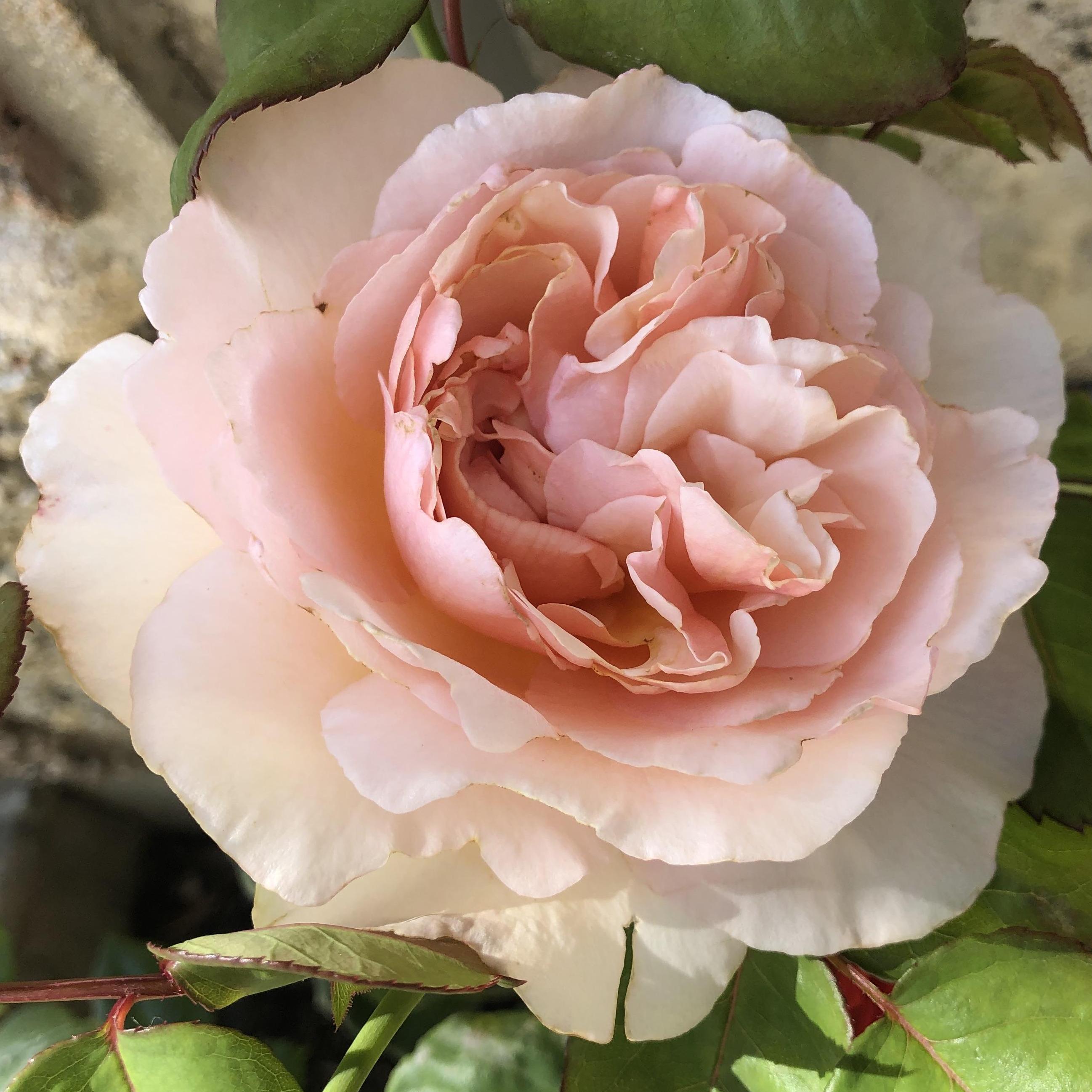 Rosa Princess Charlene de Monaco is a modern bush rose with large flowers, introduced by Meilland in 2012. This excellent creation has an impressive list of awards: Gold Medal for Large Flowers, Geneva City Prize & Perfume Prize 2011, Silver Medal & Le Roeulx Perfume Prize (Belgium) 2011, Saverne Perfume Prize 2011, Gold Medal for Large Flowers & La Tacita Perfume Cup (Italy) 2015, Grasse Republic President's Prize 2016, Baden Baden Wien Certificate 2016, and Most Remarkable Rose at Biltmore (USA) 2018. It is a small bushy shrub that reaches about 90cm (35in) in height and 50cm (20in) in spread at maturity. It has a rapid growth rate. It produces strong, thorny, and well-branched stems that bear elegant foliage of an intense and satin green. The foliage is highly resistant to diseases. From June to October, the plant produces successive waves of beautiful 11cm (4in) diameter flowers, in the form of slightly ruffled cups. They consist of 65 undulated petals and open in quarters. They are soft pink on the periphery, warmed by pale ochre in the centre. They are grouped in small bouquets of 2 to 5 units that emerge at the end of long shoots from the current year or by those that emerge from 2-year-old stems. The roses will continue to flower if faded blooms are regularly removed and the soil remains fairly moist. Their fragrance of centifolia rose is pronounced, more or less perceptible depending on the time and weather conditions. The deciduous foliage is absent in winter.