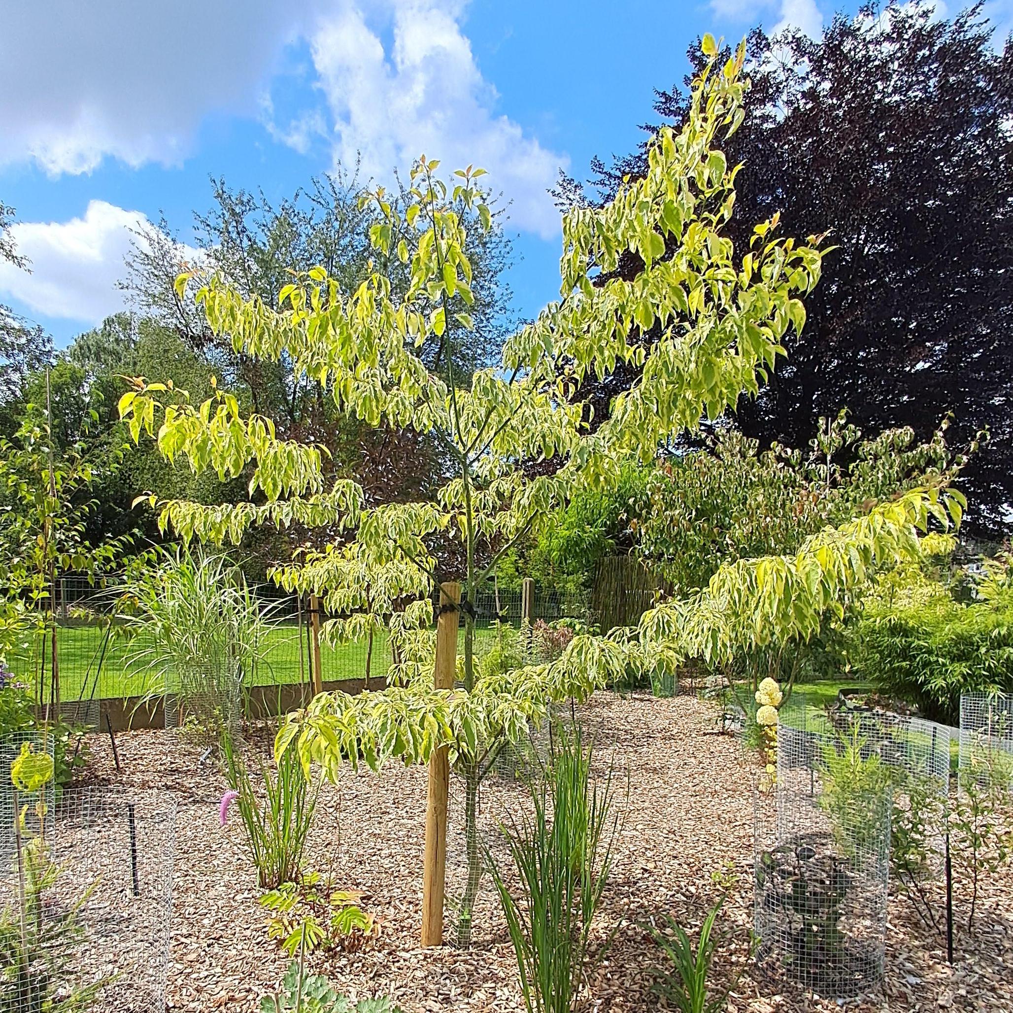 Easy to grow, this Cornus controversa Gold Star requires little maintenance, as pruning is unnecessary as it naturally takes on its distinctive habit. It prefers a fresh, humus-bearing soil, not too chalky to slightly acidic, and above all not drying out. Plant it in a sunny location only in less sunny climates, elsewhere choose a semi-shaded spot to protect it from the burning rays of too much sun. The shade will also enhance the brightness of the young foliage. Dig a hole 50 or 60 cm on each side and in depth, and if your soil is slightly chalky, mix acidic planting compost (based on turf) with the existing soil, as well as compost or leaf mould. The same advice applies to sandy soil, where it is essential to increase water retention. In this case, dig a larger planting hole and incorporate a large amount of compost. If the soil is already neutral or acidic, a slight addition of compost and manure will be sufficient at planting. For maintenance, regularly apply fertiliser, as this Cornus is a bit greedy, and also use pine bark as mulch to maintain acidity in alkaline soils. Very hardy, resistant to -20°C, it requires little maintenance, except for watering during hot periods.