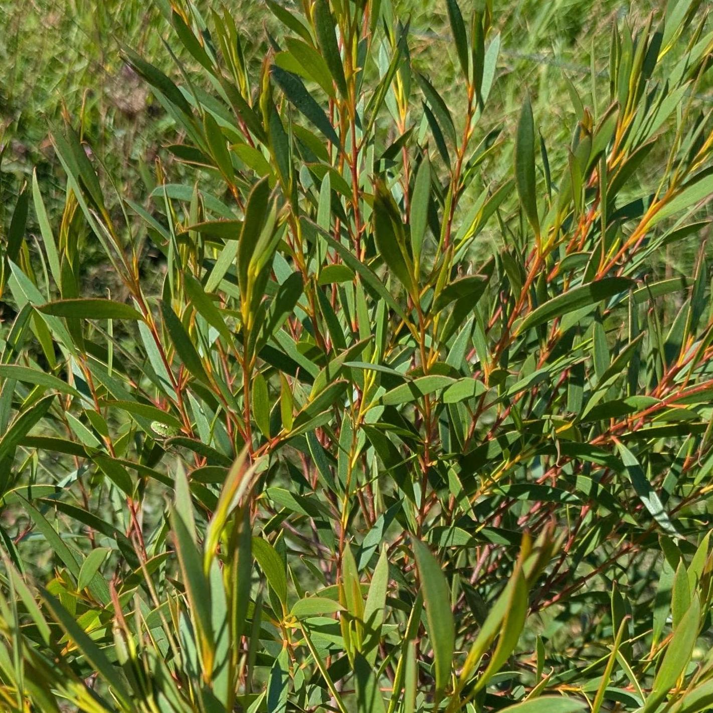 Eucalyptus moorei var. moorei is one of the two known subspecies (the other being serpentinicola). It forms a bushy shrub reaching 6 to 7 m (19 ft 8 in to 23 ft) in height and about 4.5 m (14 ft 10 in) in width. It sometimes develops a single short trunk, but more often multiple trunks, which is an advantage at the ornamental level, because the bark is very decorative. It is smooth and peels off in shreds that fall at the foot of the plant, it takes on varied colours: white, yellow, grey, beige-brown, green... This shrub is also remarkable because of its graceful, evergreen and aesthetic foliage. Its fineness earns it in Australian English the nickname of "little willow" or "narrow-leaved willow" (narrow-leaved sally), because the resemblance is indeed quite strong with this genus yet far removed from the Myrtaceae… The small juvenile foliage, is made up of opposite and sessile, ovate to elliptical leaves, only 2.8 to 4.5 cm (1.1 to 1.8 in) long and 0.6 to 2.5 cm (0.2 to 1 in) wide. They have a beautiful blue-green colour at first, then gradually turn a shiny green. The adult foliage, slightly larger, is even narrower, the lamina of the leaves measuring up to 9 cm (3.5 in) long and 1.3 cm (0.5 in) wide. Lanceolate to crescent-shaped, petiolate and alternate, also a beautiful shiny green.