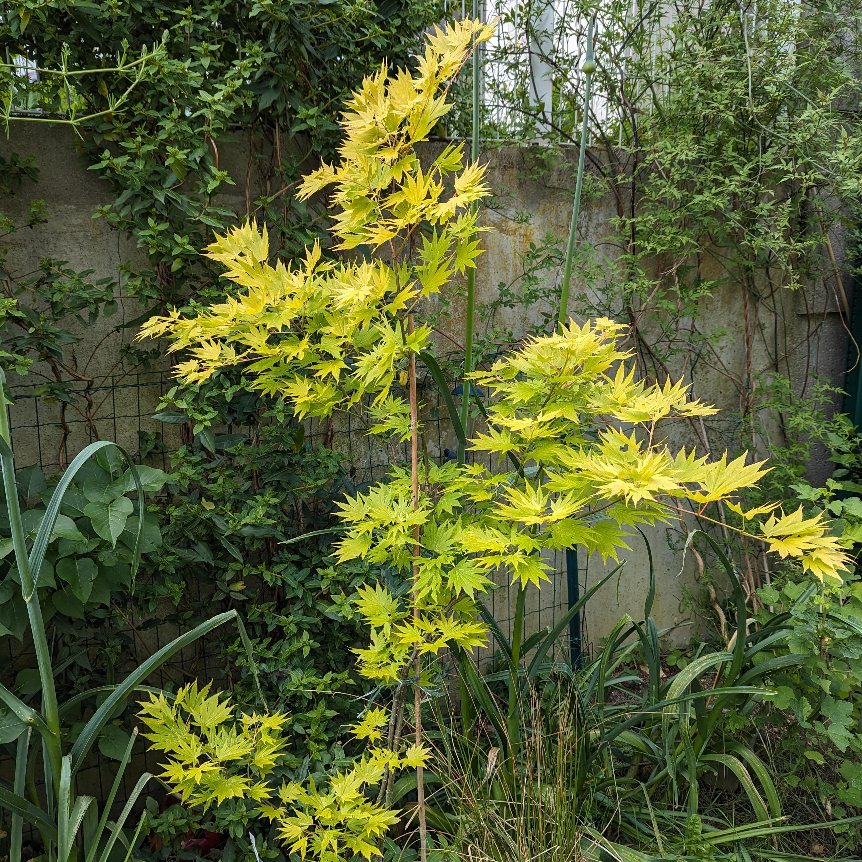 It belongs to the Sapindaceae family. Acer shirasawanum, from which it originates, is a distinct Japanese maple species from A. palmatum. It is particularly native to the mountains of Honsu and Shikoku. Its English name is charmingly "Full moon maple", due to the rounded shape of its leaves and their particularly luminous appearance. This tall tree with very slow growth, which can reach 15 m (49. 2 ft) in height in nature, is the origin of some very beautiful varieties such as the 'Aureum' forms from which the 'Jordan' maple descends.