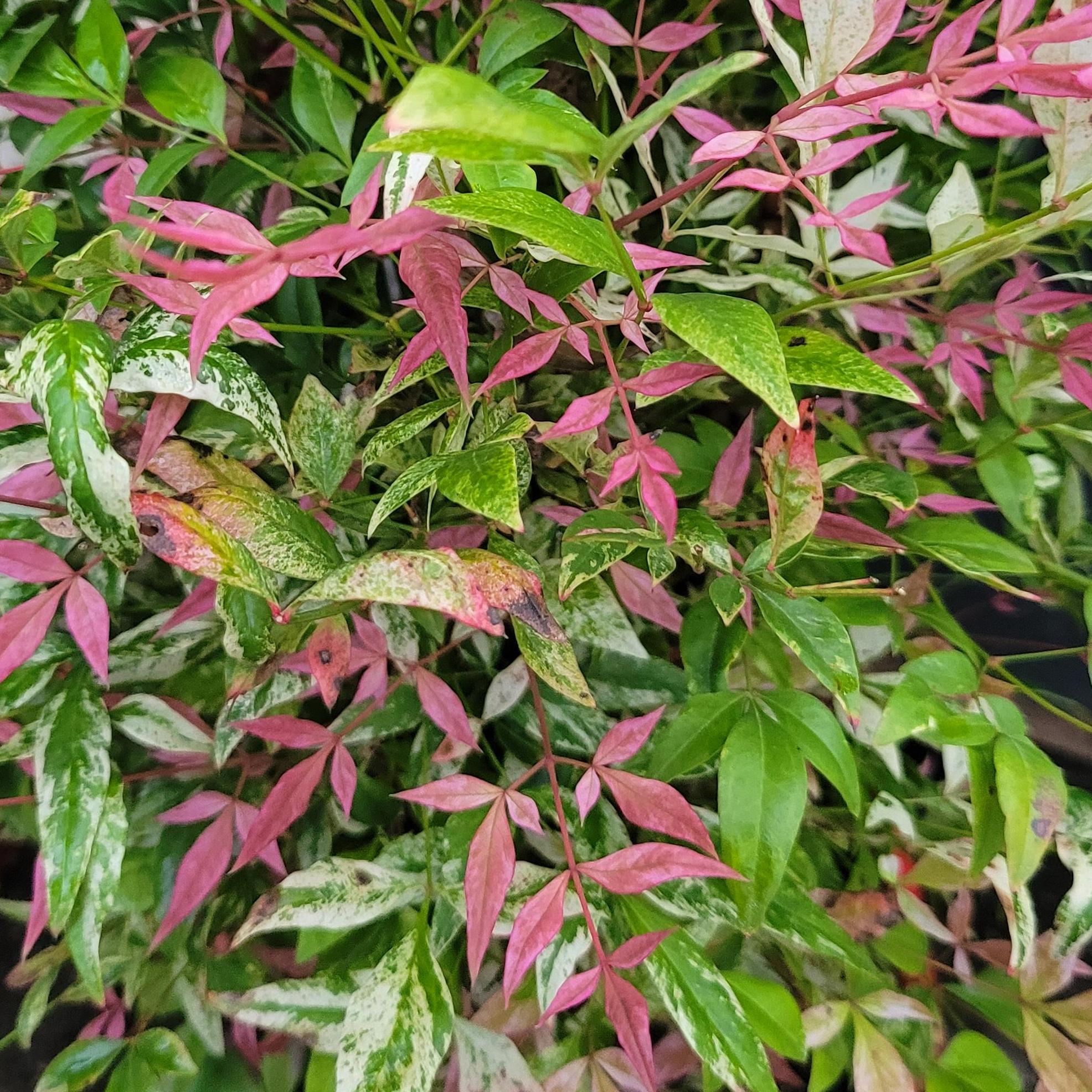 Nandina domestica, commonly called Sacred Bamboo or Heavenly Bamboo, is native to India, China, and Japan, and belongs to the Berberidaceae family. Nandina domestica 'Twilight' is a brand new variety from the United States, forming a small evergreen bush with slender upright stems and a rounded and compact habit. It grows rather slowly and at maturity reaches a maximum height of 1 m to 1.20 m (3.3 ft to 3.9 ft), with a width of about 50 cm (19.7 in). The main advantage of this cultivar lies in its dense vegetation, with spreading pinnate leaves that change colours throughout the seasons. This Sacred Bamboo displays bright pink young shoots in spring, becoming light green with a touch of cream when mature, with these colours becoming even more intense in winter. In July, it produces large paniculate clusters of small white star-shaped flowers, followed in September by clusters of red berries that are decorative throughout the winter and sometimes persist during the next flowering season.