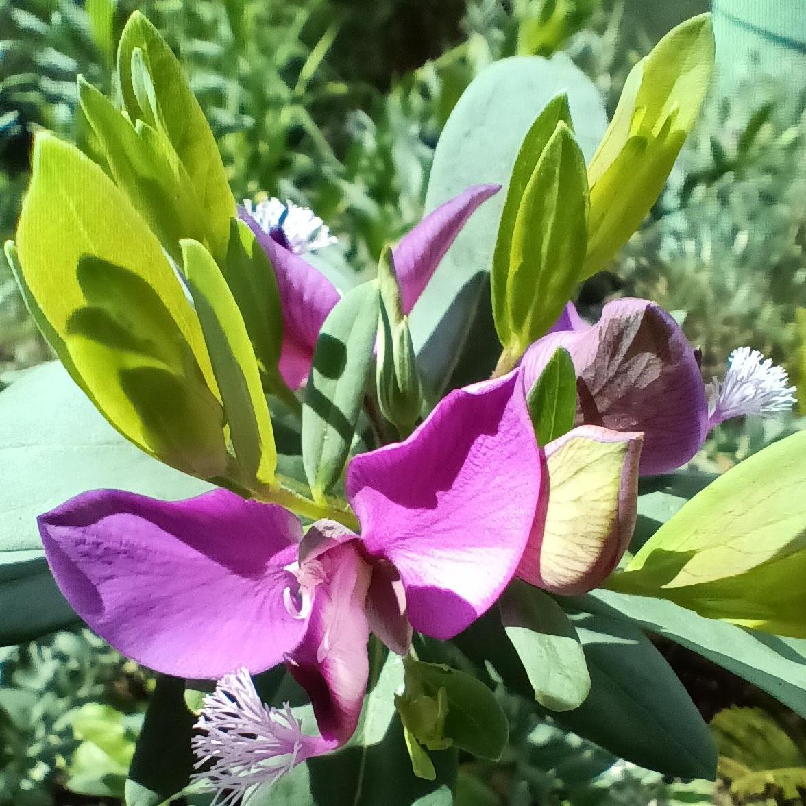 The Myrtle-leaf Milkwort is an evergreen shrub plant from the large family Polygalaceae, native to South Africa. Its natural environment, which is very variable, consists of different types of open areas, such as heathlands, cliffs, dunes, shrubland and even along streams. It forms a beautiful bush of 2m (7ft) in all directions within 3 to 4 years. While its growth is fast, its lifespan is limited. This Polygala, like many others, ensures its longevity by self-seeding, sometimes abundantly, in the most unexpected places in the garden, in favourable climates and soils. Its flowering is very vibrant, lasting about 10 months, from April-May to autumn. The flowers, gathered in terminal clusters, are papilionaceous like those of the legumes. They consist of 2 winged sepals in pink-violet and a lower petal in white-green strongly tinged with violet. The stamens emerge from the flower, forming a tuft of the same shade. The foliage is evergreen, with green or purplish branches. The small leaves are rounded to ovate, pointed at their tips, tender green and sometimes tinged with purple, 2 to 3cm (1in) long, with a more pronounced midrib. The fruit is a small winged capsule, sometimes difficult to spot on the bush.
