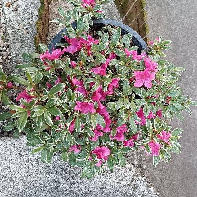 The 'Silver Queen' Japanese Azalea, also known as the hybrid Rhododendron, is a small evergreen bush with dense variegated green and white foliage, and pink fuchsia flowers that stand out from its foliage in spring.