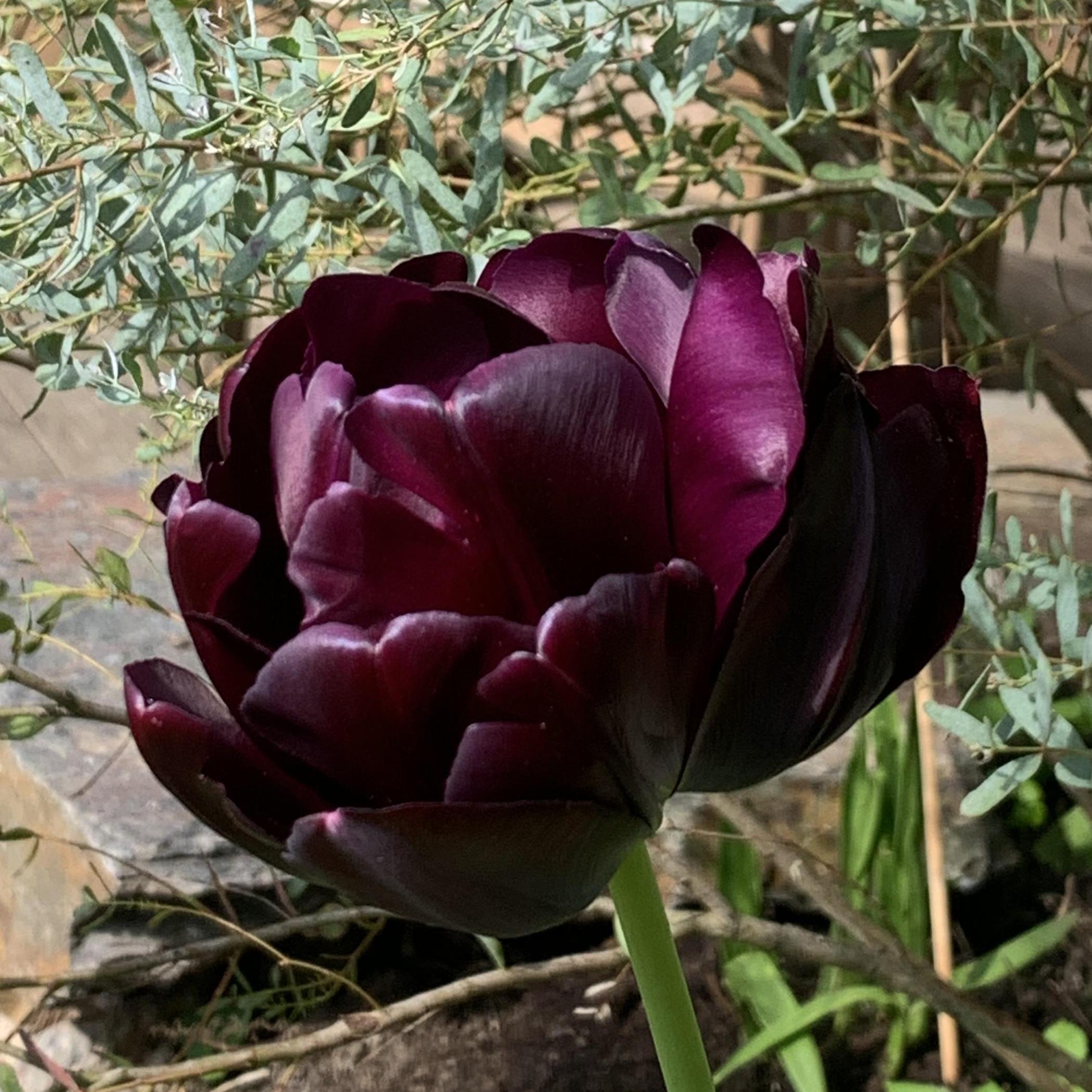 Tulipa 'Black Hero' is a double-flowering tulip that offers almost black petals arranged in an open cup shape resembling peonies, which is why they are sometimes referred to as peony-flowered tulips. With changing reflections, it is superb in the sun. You can pair it with white or pink tulips to create contrasting effects. All colours go well with it, as do double-flowered varieties, parrot tulips, and lily-flowered tulips. The enormous flowers stand atop 50cm (20in) tall stems, well above the widely lanceolate leaves. The flowers are all different but share their almost black colour. It blooms in April-May.