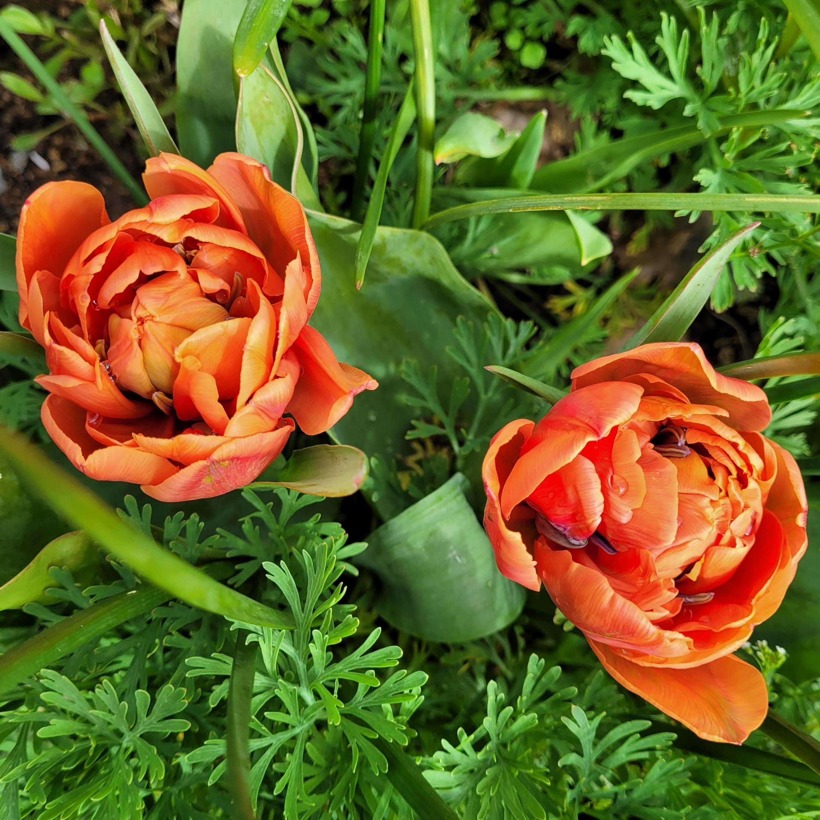 Tulipa 'Orange Princess' is a late-flowering tulip with deep orange petals slightly streaked with green and copper, arranged in an open cup shape resembling peonies, hence being known as peony-flowered tulips. You can pair it with purple tulips for a stunning contrast. The enormous flowers stand atop 35cm (14in) tall stems. The flowers are all different but share the same coppery-orange colour. It blooms in April-May.