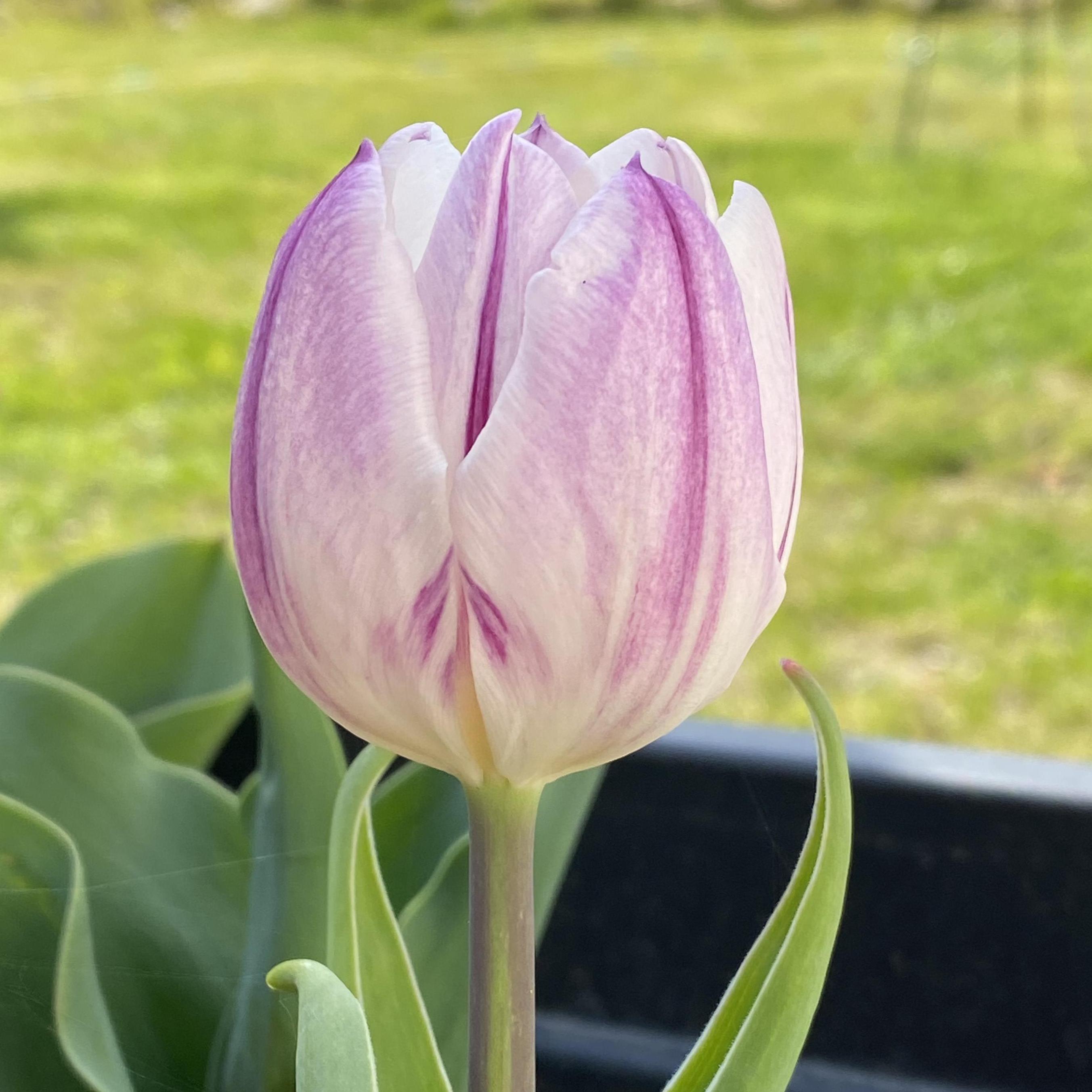 Tulipa 'Flaming Flag' is a sturdy triumph tulip bearing large and magnificent white flowers delicately streaked with light purple. It blooms in April, at the top of a tall stem that withstands wind and rain. Whether in a vase or in a border, it is an elegant and unique variety that does not go unnoticed.