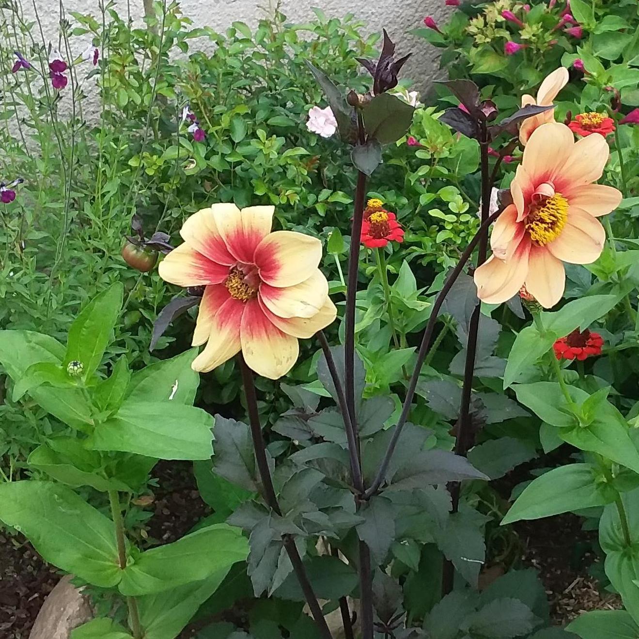 Pretty yellow-orange flowers on a lovely almost black purple foliage.