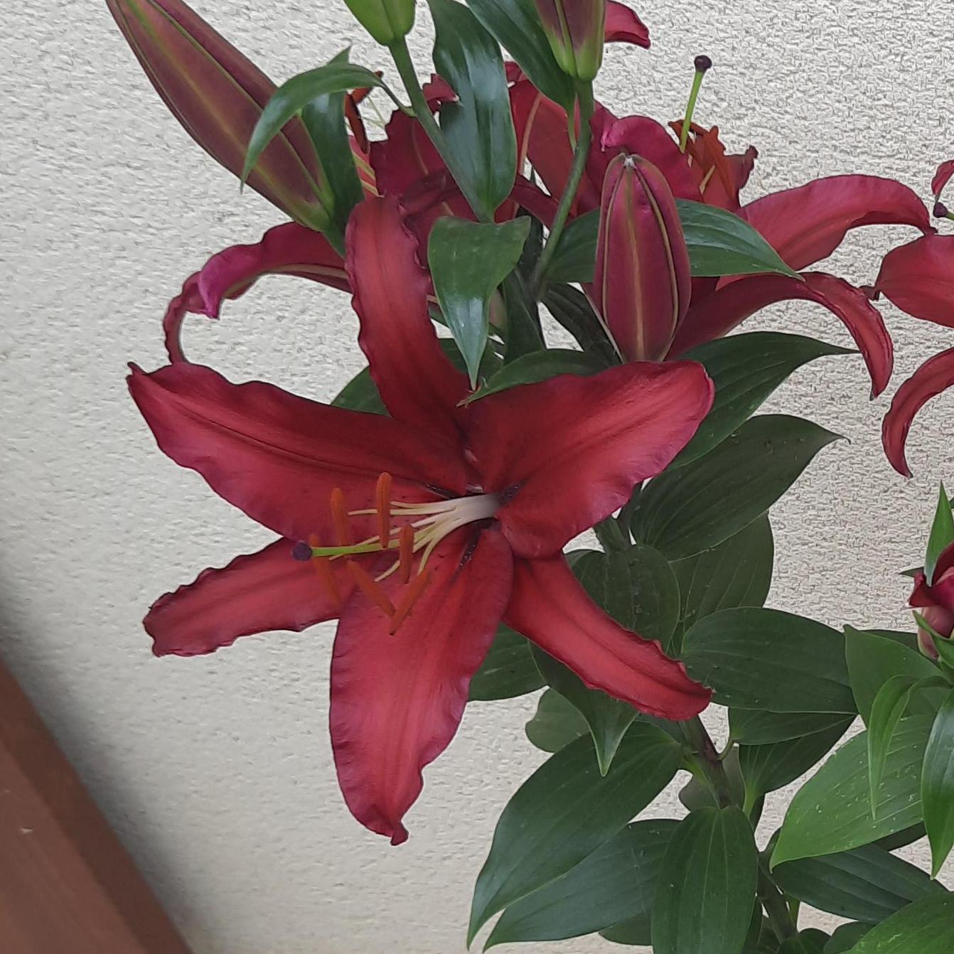 The 'Firebolt' lily is a spectacular variety that belongs to the oriental group of lilies. Its sturdy stems bear up to twenty fragrant flowers, facing upwards, with a flared trumpet shape, in a particularly dark red colour, with satin reflections and orange anthers. This robust oriental lily faithfully blooms in well-drained soil without limestone in a flower bed, in a pot, or even in a large rockery.