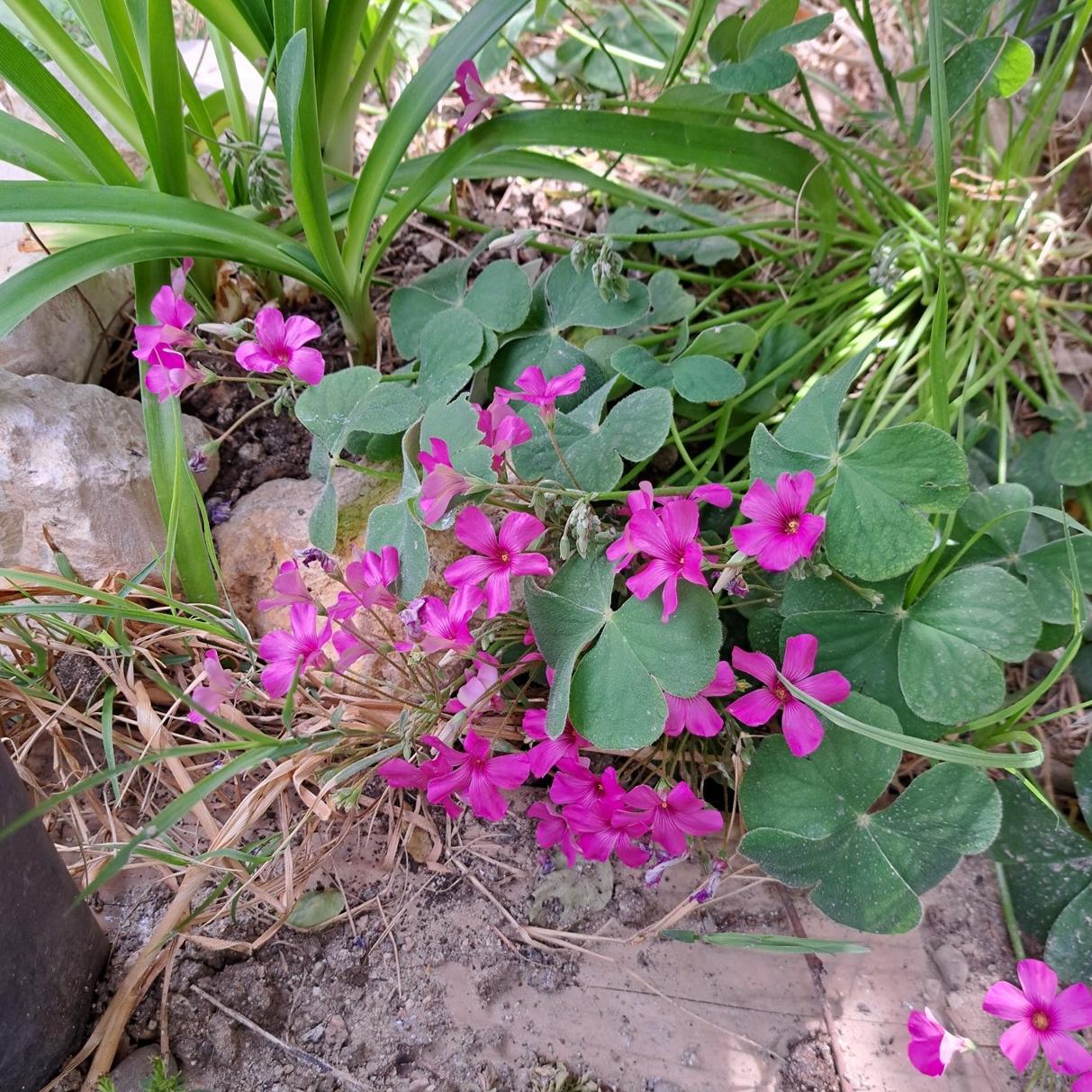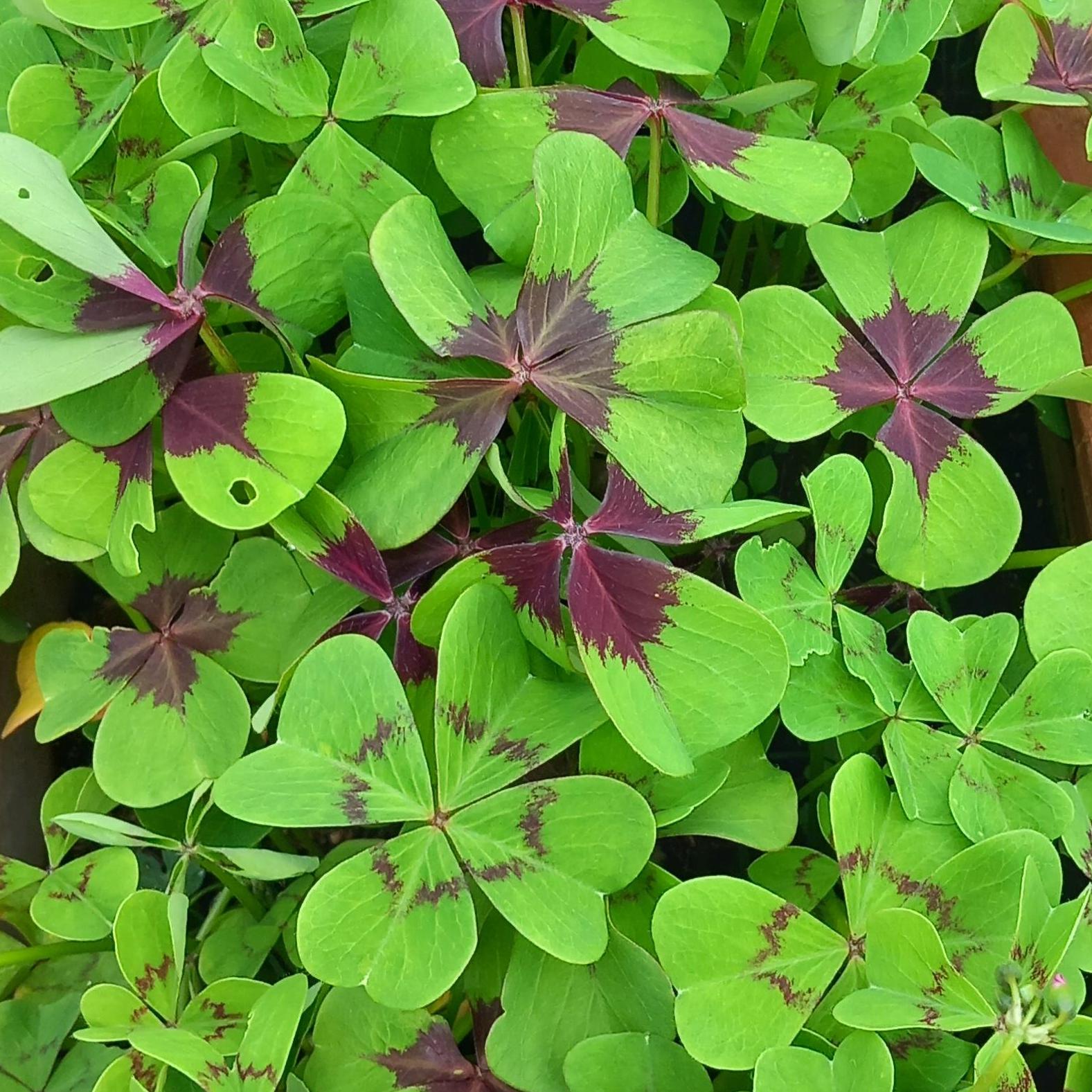 Oxalis deppei will greatly increase your chances of finding a four-leaf clover! Its clover-like green leaves are spotted with brown-purple. They are accompanied by a multitude of bright pink flowers.